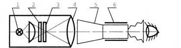 1 – источник света; 2 – молочное стекло; 3 – тест-объект в виде шкалы; 4 – объектив коллиматора; 5 – испытуемый прибор; 6 – держатель прибора.