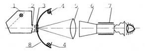 1 – осветитель; 2 – светофильтр; 3 – штриховая мира; 4 – лампы адаптометра; 5 – объектив коллиматора; 6 – испытуемый прибор; 7 – держатель прибора; 8 – адаптометр.