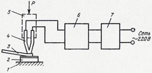 Рис. 1.5. Схема зварки тиском з непрямим імпульсним нагрівом V-подібним інструментом: 1 - робочий столик; 2 - підкладка або напівпровідниковий кристал; 3 - провідник; 4 - V-подібний інструмент (пуансон); 5 - зварювальна голівка для створення тиску; 6 - джерело живлення; 7 - реле часу [6].