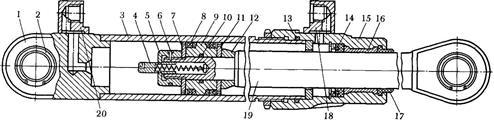 1, 15 – кришки, 2 – підшипник, 3- труба, 4 – клапан, 5 – гайка, 6 – шплінт, 7, 11 – шайби, 8, 14 – манжети, 9 – поршень, 10, 13 – ущільнювання, 12 – упор, 16 – втулка, 17 – брудознімач, 18, 20 – штуцера, 19 - шток