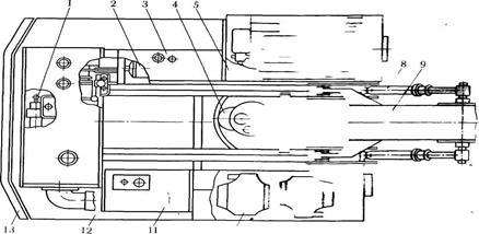 Механізм повороту (рис. 2.9) складається з поворотної колони, ланцюгової передачі і двох гідроциліндрів. Поворотний корпус 14 опирається на конічні роликопідшипники 6 і 9 іобертається відносно стакана 7 головки рамизадопомогоюланцюгової зірочки 1, яка приводиться в рухланцюгом 3 від гідроциліндрів. Обидва гідроциліндрипрацюють поперемінно. Якщо шток одного гідроциліндру втягується, то ланцюг, з’єднанийз тягою 5, повертає зірочку 1 і корпус, а інший гідроциліндр здійснює холостий хід.