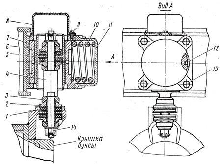 Поршень гасителя колебаний состоит из тяги 4, которая соединена с гильзой 5 поршня гасителя колебаний и кронштейном, приваренным к крышке буксы, с помощью гаек 14, через амортизаторы 1, сухари 2 и обоймы 3. Сухарь и обойма имеют сферические поверхности для компенсации возможных перекосов тяги поршня от вертикальной оси, возникающих при движении тепловоза.