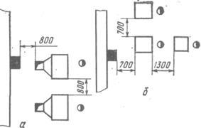 а — расстояния между колонной, ванной для очистки в препарате АМ-15 и между ваннами по фронту: б — расстояния между колонной, разборочно-сборочным стендом и между стендами, расположенными «в затылок» или по фронту.