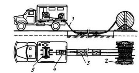 За відсутності уздовж траншеї вільного простору для пересування автотранспорту встановлюють на початку її кабельні домкрати 2, на яких закріплюють барабани з кабелем, а в кінці - машину, в кузові якої знаходяться тягова лебідка 5 і спеціальний пристрій 4 для контролю тяженія кабелю. На дно траншеї укладають ролики 3. До кінця кабелю кріплять трос У лебідки, за допомогою якого і прокладають кабель.