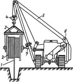 Кабель прокладають з гусеничного трубоукладача 6 і спеціальною траверси 3 Барабан 2 з кабелем закріплюється в траверсі і під дією сили тяжіння кабелю 1 обертається на осі 7 при русі трубо укладальника уздовж траншеї. Траверсу підвішують до стріли 5 трубоукладача на крюк 4.