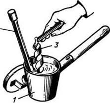 Перед випробуванням кабелю з паперовою ізоляцією підвищеною напругою перевіряють його ізоляцію 3 на відсутність вологи, використовуючи ківш 1 з розігрітим парафіном і термометр 2.