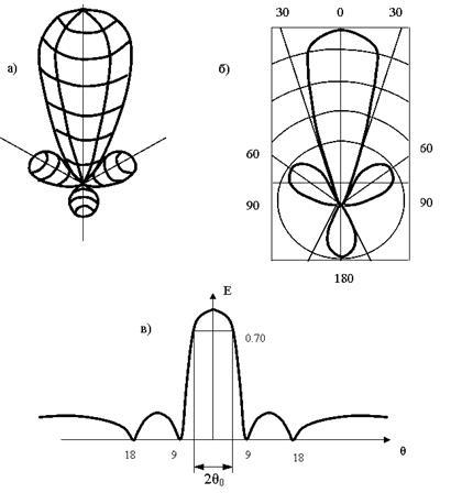 Построение диаграммы направленности возможно в полярной или прямоугольной системах координат. В общем случае может быть построена пространственная диаграмма направленности, но так как данная процедура весьма затруднительна, то на практике ограничиваются изображением ее наиболее характерных сечений, например сечений двумя ортогональными плоскостями, проходящими через максимум излучения. На рисунке 12.а показана пространственная диаграмма направленности антенны, обладающей остронаправленным излучением, а также изображение этой диаграммы для одной плоскости в полярной (рисунок 12б) и прямоугольной (рисунок 12в) системах координат.