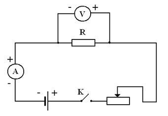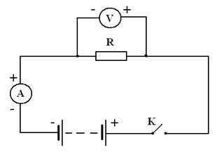 Опір провідника R можна обчислити за законом Ома для ділянки кола, якщо скласти електричне коло за схемою, поданою на малюнку 1 і виміряти амперметром силу струму I, а вольтметром - напругу U.
