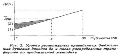 то на следующем этапе расчетов определяется фактический объем трансферта региону. Предоставление трансфертов исходит из того, что все дотационные регионы в результате выделения трансфертов должны иметь одинаковые значения приведенного душевого бюджетного дохода. Количество регионов, получающих трансферты, а также объем выделяемых им средств определяется итеративной процедурой. исходя из равенства
