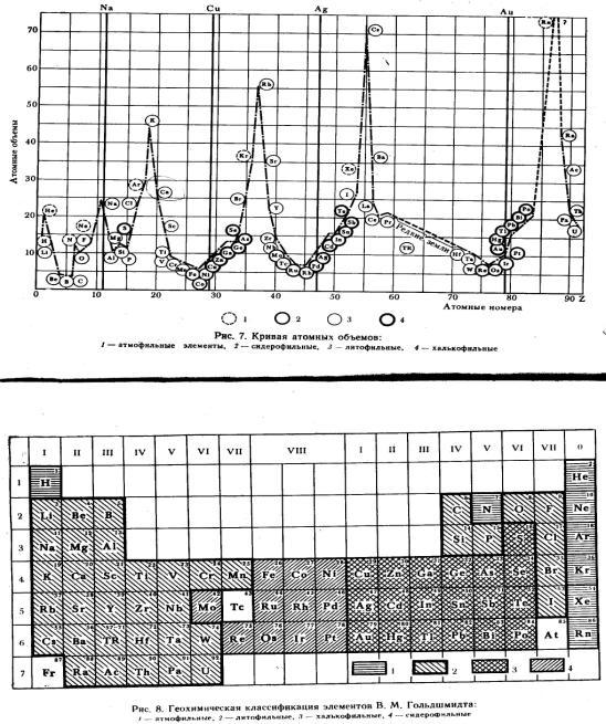 Этот ученый сравнил дифференциацию элементов в расплавленной планете с выплавкой металла из руд, когда на дно металлургической печи опускается тяжелый металл с плотностью около 7, а на поверхность всплывает легкий силикатный шлак (аналог земной коры). Между ними располагается слой «штейна» — сульфида Fe с примесью сульфидов других металлов (аналог мантии) Распределение элементов по оболочкам, по Гольдшмидту, зависело от их атомных объемов (см.рис.). Элементы, занимающие минимумы на кривой атомных объемов, дают сплавы с Fe, в ходе дифференциации они образовали земное ядро (сидерофильные элементы). Элементы, занимающие максимумы на кривой и расположенные на нисходящих её частях, обладают большим сродством к кислородую При дифференциации они образовали земную кору и верхнюю мантию (литофильные элементы). Элементы с высоким сродством к S, Se, Te (халькофильные) занимают восходящие части кривой; они сосредоточены в нижней мантии, образуют сульфидно-оксидную оболочку. Инертные газы относятся к атмофильной группе.