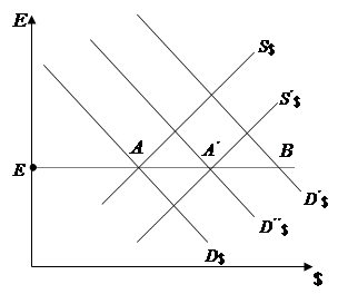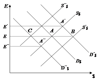 Аналогичным образом падение спроса на иностранную валюту приводит к перемещению кривой спроса на уровень D´$