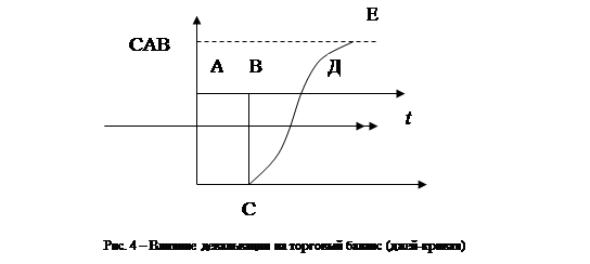 На рис. 4 показано влияние девальвации на торговый баланс – джей-кривая, которая носит название из-за своей формы. На отрезке [АВ] валютный курс стабилен. Проводят девальвацию. Это приводит к ухудшению торгового баланса [ВС]. По мере приспособления экономики к новым ценам торговый баланс, как и баланс текущих операций (САВ), постепенно выравнивается до уровня, предшествующего девальвации[СД], и в долгосрочной перспективе [ДЕ] улучшается.