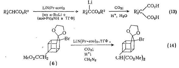 и дальнейшая процедура сводится к пропусканию диоксида углерода в раствор аниона. Последующая обработка приводит к практически чистому продукту {схема (13)}. Прекрасные результаты получены с такими стерически затрудненными сложными эфирами, как этил-2-метилпропионат; в этом случае побочные реакции не наблюдались. Хорошим примером этой реакции служит синтез адамантан-2,2-дикарбоновой кислоты. Метод можно также использовать в гомокубановой серии; сложный эфир (6) можно превратить в соответствующее производное малоновой кислоты {схема (14)} без деградации или перегруппировки «клеточного» каркаса.