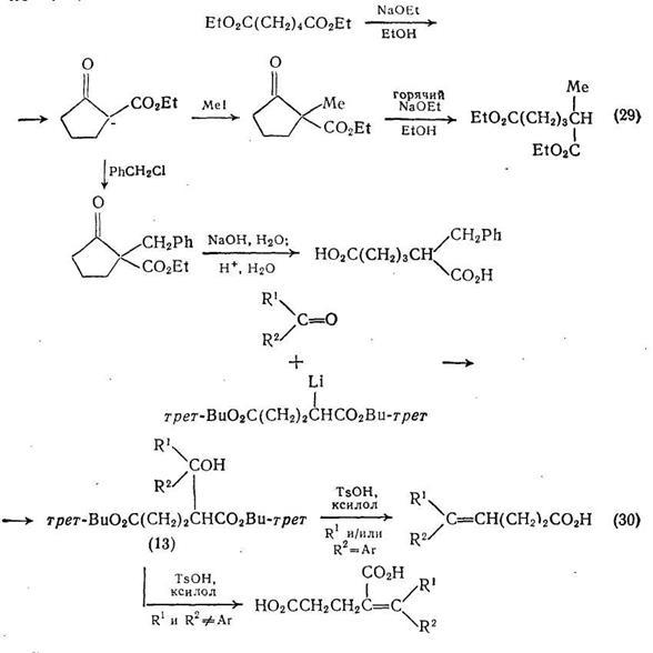 Алкильные производные янтарной кислоты можно получать алкилированием дианиона, в свою очередь полученного из моноэтилсукцината; алкилирование протекает региоспецифично {схема (28)} по соседнему со сложноэфирной группой углеродному атому. Другие а-алкильные производные адипиновой и пимелиновой кислот можно получать более сложной последовательностью реакций {схема (29)}, так как в этом случае анионы легко вступают в циклизацию по Дикману.