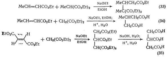 Реакция Михаэля используется для получения различных ди- и поликарбоновых кислот. В этом разделе мы рассмотрим несколько типичных примеров этой реакции. Малонат-анион присоединяется к сложным эфирам и нитрилам α,β-ненасыщенных кислот с образованием продуктов, дающих при гидролизе производные глутаровой кислоты {схемы (33)—(36)}.