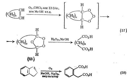 Озонолнз олефинов, как правило, проводят в органических растворителях, часто при низких температурах. Образующийся озонид (18), который обычно слишком нестабилен для безопасного выделения, можно окислять до карбоновых кислот. При окислении циклического олефина продуктом реакции служит дикарбоновая кислота {схема (57)}. Этот двухстадийный процесс можно упростить [52], так как было показано, что в благоприятных случаях эмульсии циклических олефинов и щелочного пероксида водорода мягко реагируют с озоном и с хорошими выходами образуют а,со-дикарбоновые кислоты {схема (58)}.