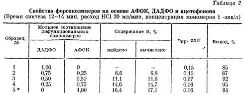 В табл. 2 представлены свойства таких сополимеров. Из данных таблицы видно, что карборансодержащий мономер легко вступает в сопо-ликонденсацию. Найденное содержание бора хорошо согласуется с рассчитанным. Можно наблюдать, как с увеличением доли АФОК уменьшается вязкость полимеров, что связано, как мы предполагаем, с обрывом цепи за счет макроциклизации в карборансодержащих сополимерах.