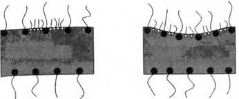Рис. 3. При растяжении пенной пленки вследствие механических вибраций или термической нестабильности поверхностная концентрация поверхностно-активного вещества в месте растяжения внезапно понижается, вызывая тем самым увеличение поверхностного натяжения и восстанавливающую силу