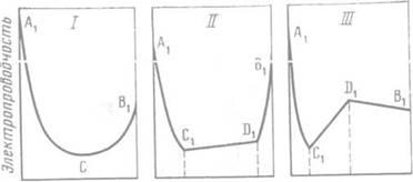 Так, на основі дослідження систем нікель-нікель-мідь-нікель і золото-золото-мідь-золото М. С. Курнаков показав, що при утвореннітвердих розчинів двох металів відбувається зниження електропровідності й що для подвійних систем металів, що дають безперервні тверді розчини, діаграма „сполука-електропровідність” виражається безперервною кривою, зверненою опуклістю до осі концентрацій (див. Рис. 3. І).