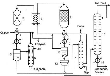 Исходное сырье, пройдя теплообменник 1, смешивается с циркулирующим газом гидроочистки и избыточным водород-содержащим газом риформинга и нагревается в первой секции печи 2. Образовавшаяся газосырьевая смесь поступает в реактор гидроочистки 3, где очищается от соединений серы, азота и кислорода. Очищенная парогазовая смесь охлаждается в теплообменнике 1 и холодильнике 4 и поступает в сепаратор гидроочистки высокого давления 5, где разделяется на циркуляционный газ и жидкий гидрогенизат (очищенный бензин). Газ, содержащий водород и сероводород, подается в абсорбер 6, где очищается от сероводорода раствором этаноламина, после чего в виде циркуляционного газа смешивается с сырьем, поступающим на гидроочистку. Гидрогенизат из сепаратора 5 поступает в отпарную колонну 7, где из него удаляют остатки сероводорода, водяные пары и газообразные углеводороды. Стабильный гидрогенизат выводится из нижней части колонны, проходит теплообменник 1, смешивается с водородсодержащим газом риформинга и, пройдя вторую секцию печи 2, поступает в батарею из трех реакторов платформинга 9. Из последнего реактора батареи газопродуктовая смесь проходит теплообменник 1 и холодильник 10 и охлажденная до ЗО°С поступает в сепаратор высокого давления 11 для отделения циркуляционного газа от жидкого катализата. Циркуляционный газ возвращается в систему платформинга и гидроочистки, а нестабильный катализат (бензин) поступает в сепаратор низкого давления 12. Из сепаратора катализат направляется в колонну стабилизации 13, где из него отделяются