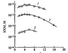 Рис. 4. Зависимость KKM от числа метиленовых групп в мостике для трех типов катионных димерных ПАВ: 1 — Ci0