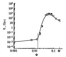 Вязкость мицеллярных растворов ПАВ зависит от формы мицелл. В случае катионного димерного ПАВ с гидрофобными радикалами С12Н25 и мостиком из двух метиленовых групп обнаруживается резкое увеличение вязкости при 2%-ной концентрации. Из рис. 7 видно, что вязкость изменяется на 6-7 порядков в очень узком концентрационном интервале. Это изменение намного больше изменений вязкости в зависимости от концентрации, характерных для обычных катионных ПАВ, и связано с резким переходом от сферических мицелл к червеобразным мицеллам. Это характерное свойство димерных ПАВ с короткими мостиками. Такой переход и увеличение вязкости можно индуцировать наложением сдвигового напряжения даже при более низких концентрациях, чем в статических условиях. Необычные реологические свойства димерных ПАВ могут найти важные практические применения.