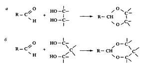 Лабильные ПАВ, производные циклических ацеталей — 1,3-диоксалана и 1,3-диоксана, представлены на рис. 8. Эти ПАВ гидролизуются в кислой среде. Их обычно синтезируют из длинноце-почечных альдегидов при взаимодействии с диолами или полиолами. Взаимодействие альдегидных групп с вицинальными гидроксигруппами приводит к образованию диоксолана, а взаимодействие с 1,3-диолами — к образованию диоксана.