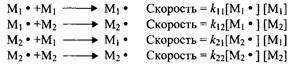 Сополимеризация может происходить в объеме фазы. Константы скорости четырех возможных путей присоединения мономера: