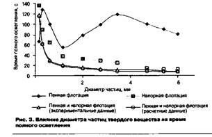 На рис. 3 показана зависимость времени полного осветления сточных вод от диаметра частиц твердого вещества при напорной и пенной флотации, а также при их совместном протекании.