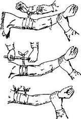 Прижатие артерий с целью остановки кровотечения применимо лишь в течение короткого времени, необходимого для подготовки наложения жгута или закрутки. Прижатие артерии к кости требует значительных усилий (рис. 2, 3, 4).