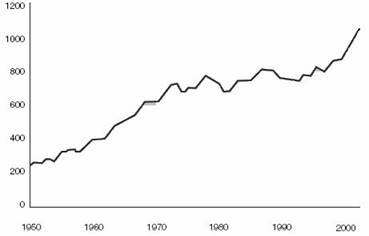 Рисунок 1. Динаміка світового виробництва сталі протягом 1950-2000 рр.