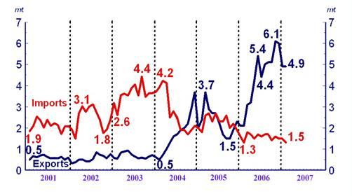 Під впливом суттєвого збільшення обсягів виробництва сталі в Китаї суттєвих змін зазнала географічна структура українського експорту. Питома вага країн Азійсько-Тихоокеанського регіону у структурі вітчизняного експорту металопродукції у І півріччі 2006 року зменшилась до 13,9% , проти 22,3% у відповідному періоді попереднього року. Як видно з наведеного малюнка (Рисунок 5), вітчизняні металургійні підприємства у січні-червні поточного року суттєво збільшили обсяги реалізації своєї продукції на Європейському та Американському ринках, чому сприяло набуття Україною статусу країни з ринковою економікою.
