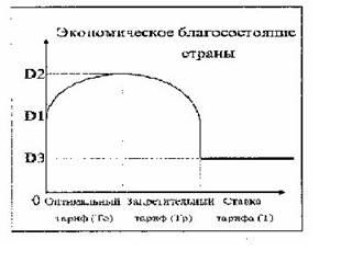 При отсутствии тарифа (Т=0) экономическое благосостояние большой страны находится на уровне D1. Максимальное положительное воздействие тарифа на экономическое благосостояние достигается при оптимальном уровне тарифа То, при котором за счёт превышения выигрыша от улучшения условий торговли над потерями от введения тарифа экономическое благосостояние возрастает до уровня D2. Затем, по мере увеличения ставки тарифа, экономические потери начинают всё более перекрывать получаемый выигрыш до тех пор, пока уровень тарифа не станет настолько высоким или запретительным (Тр), что импорт товара в страну потеряет экономический смысл. Из-за отсутствия более дешёвого импорта экономическое благосостояние страны упадёт на уровень D3. Дальнейшее увеличение ставки тарифа уже никак не сможет сказаться на экономическом благосостоянии, поскольку импорта просто не будет.