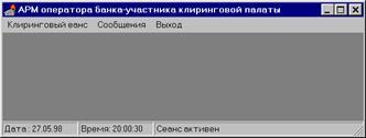 Модуль «АРМ оператора клиринговой палаты» устанавливается на рабочих станциях банков-участников системы взаимозачета и обеспечивает следующие функции: подключение банка к текущему клиринговому сеансу, выход от сеанса, отсылку платежных сообщений, а также подсчет и просмотр окончательной чистой позиции банка. Работой модуля также управляет один человек – оператор банка.