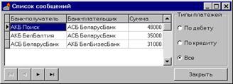 Выбор подпункта «Показать сообщения» приводит к выводу на экран диалогового окна со списком сообщений, которые относятся к банку-владельцу запущенной копии модуля. Можно выбрать для показа входящие платежи, исходящие платежи или оба типа одновременно. Показываются лишь те сообщения, которые были подтверждены клиринговой палатой в модуле «АРМ оператора клиринговой палаты». Вид этого окна приведен на Рис. 3.7.