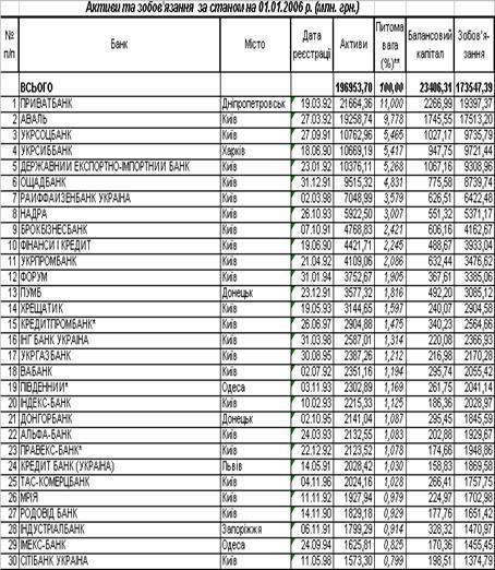 Таблица Б.1 Активи та зобов”язання перших 30 банківських установУкраїни станом на 01.01.2006 року [37]