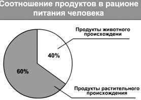 Все продукты можно разделить на две большие группы: животного и растительного происхождения. В рационе питания человека доли пищевых продуктов животного и растительного происхождения должны составлять примерно 40 и 60%. Только в этом случае достигается полноценное, сбалансированное питание.