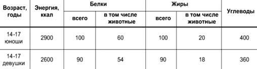 Рекомендуемое количество энергии, белков, жиров и углеводов для детей и подростков.