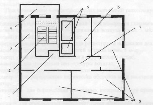 1 - шахта дымоудаления; 2 - незадымляемая лестничная клетка первого типа (H1); 3 - переход на лестничную клетку; 4 - балкон; 5 - шахты лифтов; 6 - лифтовой холл; 7 - поэтажный коридор; 8 - квартира (помещение).