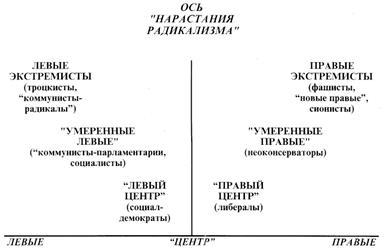 . Наряду с этой общепринятой градацией по мере нарастания стратегического и тактического радикализма можно также выделить “центристов”, “умеренных” и “экстремистов”, причем как “слева”, так и “справа” от условного “центра”, куда по традиции принято “помещать” приверженцев срединной политики допустимых компромиссов, колеблющихся в зависимости от ситуации то в одну, то в другую сторону. Полученный спектр политических течений удобно проиллюстрировать двухмерной схемой (см. рис. 1)