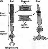 Палочки и колбочки образуют плотно организованный слой фоторецепторов, расположенный непосредственно над слоем пигментного эпителия (рис.3), на максимальном удалении от роговицы и проникающего в глаз света. За исключением небольшой зоны в области центральной ямки, свет должен пройти через несколько плотных слоев клеток и волокон, чтобы достигнуть наружного сегмента фоторецептора, где и осуществляется поглощение фотонов и фоторецепция. Как Гельмголъц писал в 1867открыт синапс и вообще появилась клеточная доктрина*).