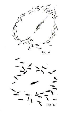 для стаи песчанки (Ammodytidae), преследуемой пловцом. В момент внезапного испуга (например, бросок хищника) стая мелких рыб часто рассыпается веером, что также дезориентирует хищника. Рассеявшаяся таким образом стая обычно снова быстро восстанавливается. Следует заметить, что картина реагирования стаи пелагических рыб на хищника и специфика ее маневрирования в значительной степени зависят также от соотношения направлении движения стаи и движения хищника.
