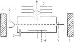 Рис.3. Схема ионного источника типа источника А. Нира: 1 - постоянный магнит; 2 - катод; 3 - выталкивающий электрод; 4 - поток электронов; 5 - ловушка электронов; 6 - ионный луч; 7 - ввод в-ва.