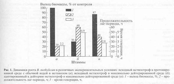 O глюкоза расходуется менее эффективно. Вместе с тем мы не исключаем, что все эти вышеназванные эффекты могут возникать не вследствие ингибирования дейтерием биосинтеза , а в результате неэквивалентной замены БВК на биомассу метилотрофных бактерий. Предметом дальнейших исследований будет разработка и оптимизация сбалансированных по ростовым факторам сред на основе биомассы метилотрофных бактерий.