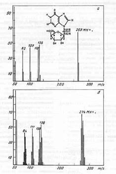 Масс-спектр полученного инозина приведен на рис. 4, б относительно контрольного (а) (немеченный инозин). Как видно из рис. 4, присутствие в масс-спектре дейтерированного образца пика, соответствующего катионизированному молекулярному иону инозина МН+. с m /z 274 (вместо m/z 269 в контрольных условиях), а также пиков характерных фрагментов рибозы [C5