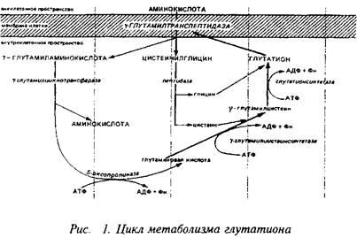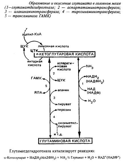 Метаболическая компартментализация аминокислот, в частности аминокислот глутаминовой группы, особенно ярко проявляется в субклеточной локализации ферментов в ГАМК-ергическом нейроне и в астроцитах. Так, пируваткар-боксилаза локализована преимущественно в астроцитах, в то время как пируватдегидрогеназный комплекс более активен в нейронах, чем в астроцитах. Преимущественная локализация пируватдегидрогеназы в нейронах ответственна в конечном счете за низкое включение углерода глюкозы, лактата и глицерина в глутамин. Глутамин-синтетаза преимущественно локализована в астроцитах, а глутаминаза - в нейронах. Глутамат, поглощаясь астроцитами, превращается в глутамин в глутамин-синтетазной реакции. Глутамин, выйдя из астроцитов и входя в нейроны, образует глутамат и далее ГАМК. Таким образом, глутамин и ГАМК осуществляют коммуникацию между большим и малым метаболическими компартментами.