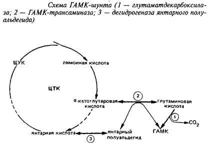 Одним из главных компонентов пула свободных аминокислот головного мозга различных животных является у-аминомасляная кислота, продукт а-декарбоксилирования глута-миновой кислоты. Цикл превращений ГАМК в мозге включает три сопряженных энзиматические реакции, получившие название ГАМК-шунта.