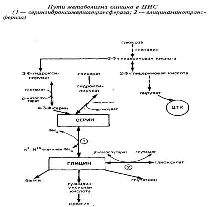 Так как потребление глицина в нервной ткани относительно велико, а поступление его из крови происходит медленно, значительная часть глицина синтезируется в мозге denovo. Глюкоза и серии являются главными источниками глицина в ЦНС. Серии может образовываться из глюкозы через 3-фосфоглице-риновую кислоту. Кроме того, серии сравнительно быстро поступает из циркулирующей крови. Синтез глицина denovo происходит в нервной ткани из серина путем обратимой N, W-метилентетрагидрофолат-тет-рагидрофолатзависимой трансформации при участии фермента серингидроксил1етилтрансферазы. Реакция катализируется серингидроксиметилтрансферазой и протекает следующим образом: