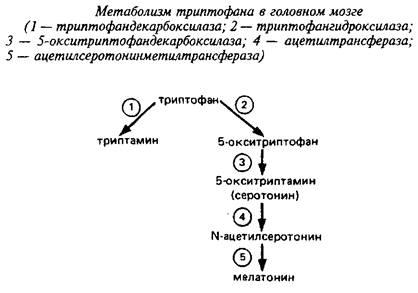 Вторая ступень катализируется 5-окситриптофандекарбокси-лазой и ведет к образованию серотонина. В эпифизе серотонин при участии специфической ацетилтрансфера-зы ацетилируется с образованием N-ацетилсеротонина; последний подвергается О-метилированию с участием фермента метилтрансферазы, используя в качестве донора метильной группы S аденозилметионин При этом образуется гормон эпифиза мелатонин. Активность двух последних ферментов ответственна за изменение светового - темнового цикла у животных и зависит от циркадного ритма.