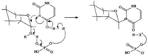 Внутри живой клетки такой процесс катализируется ферментами, которые, как правило, работают стереоспецифично: это значит, что они будут избирательно вовлекать в реакцию какой-либо один из диастереомеров, а также осуществлять реакцию по какому-либо одному механизму, что в итоге приведет к продукту одной изомерной формы. Схематично такую реакцию можно представить, моделируя реагент и фермент в виде единой молекулы, на одном конце которой находится остаток фосфорной кислоты, катализирующий отщепление гидроксильной группы, на другом конце - нуклеофильный остаток, атакующий электрофильный атом углерода. Синхронное воздействие каталитического и нуклеофильного фрагментов на электрофильный центр а-глюкопиранозы приводит к соответствующему в-гликозиду.